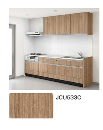 2位のJCU533Cと色味は似ていますが、木目が横に流れることで、キッチンをワイドに見せる視覚効果があります。